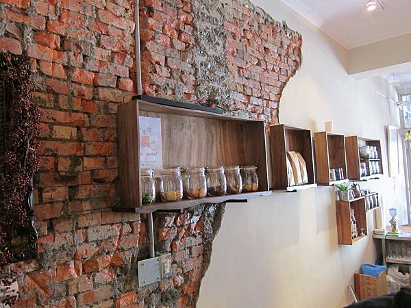 半面的紅磚搭上刻意保留的白漆面、抽屜展示櫃,