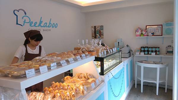 Peekaboo一字直譯是「躲貓貓」,有個隱身在巷弄間讓客人尋找的含意,一旦找到了就會有驚喜感覺。說是麵包屋,倒不如說是糕餅店,想像得到的甜點、麵包、土司、水果塔、手工餅乾都有,地方不大,但是白色和淡藍色的高雅氛圍,實在顛覆一般麵包店的刻板裝潢。